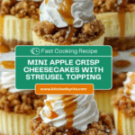 These Apple Crisp Mini Cheesecakes are a delightful fusion of creamy cheesecake and warm apple crisp in one bite-sized dessert. Perfect for gatherings or a cozy treat, they combine a graham cracker crust, spiced apples, and a crumbly streusel topping finished with a drizzle of caramel sauce.