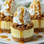 These Apple Crisp Mini Cheesecakes are a delightful fusion of creamy cheesecake and warm apple crisp in one bite-sized dessert. Perfect for gatherings or a cozy treat, they combine a graham cracker crust, spiced apples, and a crumbly streusel topping finished with a drizzle of caramel sauce.