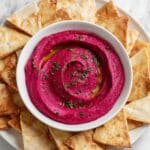 Beet hummus pairs well with pita chips, naan, fresh vegetable sticks like carrots and cucumbers, or as a spread on sandwiches and wraps.