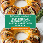 Keywords: Brie cheese wreath, cranberry sauce appetizer, Christmas appetizer, holiday puff pastry recipe, festive cheese wreath