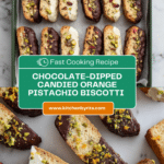 Candied Orange and Pistachio Biscotti are twice-baked Italian cookies featuring crunchy pistachios and vibrant candied orange peel. These biscotti are dipped in rich white and dark chocolate for an elegant finish, perfect for dipping in coffee or gifting during the holidays.