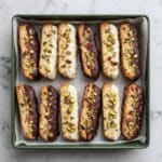 - Dip Biscotti in Chocolate: Dip half of each biscotti slice into the melted white or dark chocolate, allowing excess chocolate to drip off. Place dipped biscotti on parchment-lined baking sheets. Optionally, sprinkle additional chopped candied orange peel and pistachios on top. Let the chocolate set before serving.