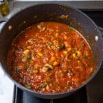 - Step 4: Pour in crushed tomatoes and 400 ml (1.5 cups) water. Add bay leaves and stir to combine. Bring to a boil, then reduce heat to low and simmer uncovered until thickened and reduced, about 30 minutes.