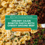 Keywords: bowtie pasta, Cajun ground beef, garlic cream sauce, cheesy pasta, easy dinner, one pan, comfort food