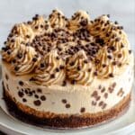 This decadent Chocolate Chip Cookie Dough Cheesecake combines a buttery graham cracker crust with a creamy cream cheese filling studded with mini chocolate chips and chunks of edible cookie dough. Topped with fluffy whipped cream rosettes and more chocolate chips, this no-bake cheesecake is perfect for cookie dough lovers looking for a rich, indulgent dessert.