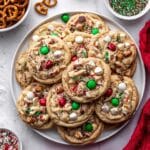 - Fold in Mix-Ins: Gently fold in the red and green M&M’s, white chocolate chips, pretzel pieces, potato chip pieces, and the red and green jimmies with a spatula until everything is evenly distributed through the dough.