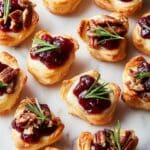 Cranberry Brie Bites are delightful mini appetizers featuring creamy Brie cheese, tangy whole berry cranberry sauce, and crunchy roasted pecans all wrapped in flaky crescent dough. Perfect for holiday gatherings or any party, these bite-sized treats offer a harmonious blend of sweet, savory, and nutty flavors with a fragrant hint of fresh rosemary.