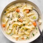 Store leftovers in an airtight container in the refrigerator for up to 3 days. Reheat gently on the stove over low heat, stirring occasionally to avoid scorching. The noodles may absorb some broth when stored; add a splash of chicken broth or water when reheating to restore the soup’s creamy consistency.