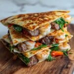 Creole Steak and Shrimp Quesadillas combine tender, seasoned ribeye and succulent shrimp with vibrant bell peppers and a smoky Creole sauce. These quesadillas offer a flavorful twist on a classic favorite, perfect for a satisfying meal any day.