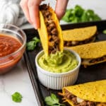These Crispy Ground Beef Tacos combine seasoned ground beef and melted Oaxaca cheese folded inside golden, oven-baked corn tortillas for a deliciously crunchy and cheesy Mexican-inspired meal that’s perfect for a quick weeknight dinner.