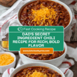 Dad’s Award Winning Secret Ingredient Chili is a hearty, flavorful chili recipe that combines ground beef, beans, tomatoes, and unique additions like semi-sweet chocolate and coffee grounds to create a rich, complex taste. Slow-simmered for three hours, this chili is perfect for family gatherings or cozy meals, delivering a perfect balance of savory, sweet, and smoky flavors.