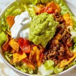 A flavorful and crunchy Dorito Taco Salad combining seasoned ground beef, fresh iceberg lettuce, juicy tomatoes, and nacho cheese Doritos, all tossed in zesty Catalina dressing and optionally topped with creamy sour cream and guacamole. Perfect for a quick and satisfying meal that brings the zest of tacos to a fresh salad bowl.