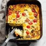 - Combine and Assemble: Pour the sautéed vegetable and spinach mixture into the prepared baking dish. Then pour the JUST Egg mixture over the vegetables. Gently fold together using a spatula to combine evenly. Sprinkle the remaining ½ cup of vegan Parmesan cheese over the top and arrange halved cherry tomatoes on the surface for garnish.