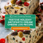 This Festive Holiday Antipasto Cream Cheese Log is a flavorful and visually appealing appetizer perfect for holiday gatherings. It combines creamy cream cheese with sun-dried tomatoes, olives, roasted red peppers, salami, and Parmesan cheese, seasoned with Italian herbs and spices. Rolled into a log and chilled, then garnished with fresh herbs and crunchy nuts, this no-cook dish is easy to prepare and sure to impress your guests.