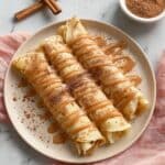 - Fill and serve: Lay each crepe flat and spread about 2 tablespoons of the cinnamon yogurt filling in the center. Roll up tightly and place on a serving plate. Sprinkle the cinnamon-sweetener topping over the crepes. Serve immediately while warm for the best texture and flavor.