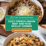 This French Onion Beef and Rice recipe combines the rich flavors of caramelized onions, savory ground beef, and tender rice, all enhanced with a French Onion Skillet Sauce. Topped with melted Gruyére cheese and mixed with peas and carrots, this one-pan meal is comforting, flavorful, and perfect for an easy weeknight dinner.