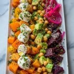 - Assemble the salad: On a long white platter, arrange the roasted pumpkin, roasted beets, diced avocado, and crispy chickpeas evenly.