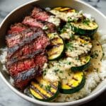 This Grilled Steak Bowl with Sauce & Grilled Zucchini is a flavorful, easy-to-make meal featuring tender grilled steak paired with charred zucchini and a creamy herb sauce. Served over jasmine rice or mashed potatoes, it offers a balanced and satisfying dish perfect for weeknight dinners or casual gatherings.