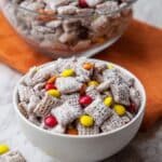 Halloween Puppy Chow is a festive and delicious snack mix made with gluten-free Rice Chex cereal coated in a rich blend of melted butter, semisweet chocolate chips, and creamy peanut butter. Sweetened with powdered sugar and sprinkled with Reese’s Pieces candies, this treat is perfect for Halloween gatherings and party snacks.