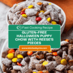 Keywords: Halloween Puppy Chow, Gluten Free Snack, Chex Mix, Peanut Butter Chocolate Recipe, Reese’s Pieces Treat, Easy Halloween Snack