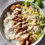 - Assemble the bowls: In serving bowls, optionally add a base of romaine lettuce or mixed greens. Add a scoop of cilantro lime rice, then top with cooked chicken and a generous portion of the street corn salad. Drizzle with remaining Elote dressing, add a squeeze of fresh lime juice, and garnish with diced avocado and cherry tomatoes if desired.