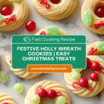 Holly Wreaths are charming, festive cookies perfect for holiday gatherings. These buttery, delicately sweet treats are decorated with colorful candies to resemble traditional holiday wreaths, adding whimsy and cheer to your dessert table.
