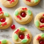 - If you don’t have a cookie press, pipe the dough using a star-shaped piping tip from a pastry bag to form the wreaths.