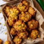 Crispy, golden jalapeno corn nuggets bursting with sharp cheddar and sweet corn, perfectly fried to create a deliciously spicy and savory snack or appetizer.