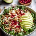 A vibrant and festive Juicy Christmas Salad featuring a mix of fresh greens, crisp apples, creamy avocado, tangy goat cheese, and jewel-like pomegranate seeds, tossed with crunchy candied walnuts and pumpkin seeds. Finished with a luscious honey mustard and fig jam dressing with a hint of spice and citrus, this salad is perfect for holiday gatherings or any celebration.