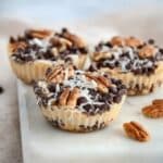 - Step 9: In a small bowl, mix together coconut, chopped pecans, and dark chocolate chips. Add 2 tablespoons of this mixture on top of the sauce in each muffin liner, then add another teaspoon of the sauce over the topping.