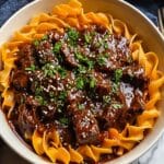 Savor the rich and comforting flavors of Korean Beef Noodles, a hearty slow-cooked dish featuring tender beef chuck simmered in a savory, spicy broth with ginger, garlic, and gochujang, served over fresh or dried noodles and garnished with green onions and sesame seeds. Perfect for a cozy meal with authentic Korean-inspired taste.