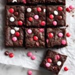 Indulge in rich, fudgy M&M’s Brownies featuring a luscious blend of melted butter, semi-sweet chocolate, and Dutch cocoa powder, topped with colorful M&M chocolate candies for a fun and vibrant twist on a classic brownie recipe. Perfectly baked to achieve moist, chewy edges and a glossy, shiny texture inside.