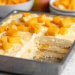 - Step 12: Top with fresh mango chunks and drizzle with extra mango puree if desired. Slice and serve.