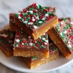 This Melt In Your Mouth Toffee is a rich and buttery treat featuring a perfectly cooked hard crack sugar base topped with melted chocolate chips and optional nuts or festive sprinkles. The toffee is cooked slowly on the stovetop ensuring a smooth, non-grainy texture. Once cooled and set, it offers a delightful crunch and melt-in-your-mouth sweetness, ideal for holiday gifting or indulgent snacking.