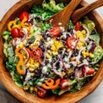 - Assemble Salad: For immediate serving, top the prepared lettuce with cherry tomatoes, corn, black beans, bell peppers, and diced avocado. Drizzle the dressing over the salad according to your preference, adjust seasoning if needed, and serve fresh.