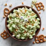 Monster Munch Popcorn is a fun and festive snack mix featuring crunchy popcorn, pretzel pieces, and candy-coated chocolates covered in a vibrant green white chocolate drizzle, finished with candy eyes for a playful monster-themed treat. Perfect for parties, Halloween, or anytime you want a sweet and salty snack with a colorful twist.