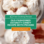 Old-Fashioned Divinity Candy is a classic, fluffy, and sweet confection made by whipping hot sugar syrup into stiff egg whites, combined with crunchy pecans and fragrant vanilla. This old-fashioned treat is known for its delicate, melt-in-your-mouth texture and crisp exterior, perfect for holiday gifting or special occasions.