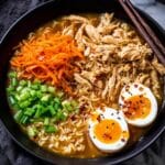 This Quick Chicken Ramen Recipe is an easy, flavorful dish that brings a comforting bowl of homemade ramen to your table in under 30 minutes. Made with tender shredded chicken, aromatic garlic and ginger, a rich soy-based broth, and topped with fresh spring onions, hard-boiled eggs, and crunchy carrot strips, this recipe is perfect for a satisfying weeknight meal.