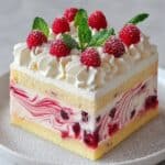 This Raspberry Swirl Cheesecake offers a luxurious and creamy dessert experience, featuring a buttery graham cracker crust, a smooth cream cheese filling gently swirled with vibrant raspberry puree, and topped with luscious whipped cream and fresh raspberries for a refreshing finish.