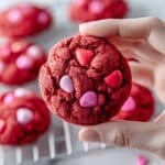 Keywords: Red Velvet Cookies, M&M Cookies, Cake Mix Cookies, Easy Cookies, Valentine’s Day Cookies, Quick Dessert