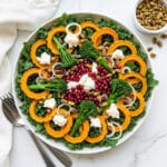 A vibrant and healthy Roasted Delicata Squash & Kale Salad featuring tender roasted delicata squash and broccolini, massaged kale, crunchy pistachios, tangy goat cheese, and fresh pomegranate seeds, all tossed in a flavorful lemon and thyme vinaigrette. This nutrient-packed salad combines roasted and fresh ingredients for a delicious balance of textures and flavors.