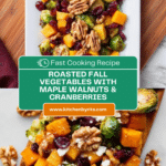 This Roasted Fall Vegetables with Cranberries and Maple Walnuts recipe features a vibrant, seasonal mix of roasted Brussels sprouts, butternut squash, and shallots, enhanced with warm cinnamon and sweet-tart dried cranberries. Topped with crunchy maple-glazed walnuts and optional creamy goat cheese, this dish is a perfect side for autumn meals or a cozy holiday gathering.