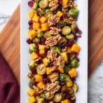 Keywords: roasted vegetables, fall recipe, Brussels sprouts, butternut squash, cranberries, maple walnuts, autumn side dish, vegetarian
