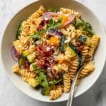 - Use chunky pasta shapes like fusilli to hold onto the roasted veggie and feta mixture better.