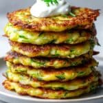Rustic crispy zucchini pancakes are a delightful way to enjoy fresh summer zucchini. These golden, flavorful fritters are easy to prepare and perfectly paired with a creamy dollop of sour cream on the side.