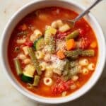 - Finish and Serve: Remove and discard the bay leaves from the soup. If desired, ladle the minestrone into bowls and top each serving with grated Parmesan cheese for extra flavor. Serve hot and enjoy the comforting warmth of this classic soup.