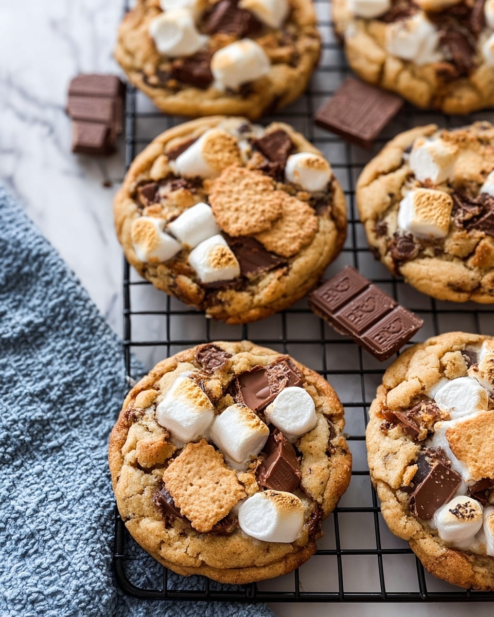 - Add Toppings: Remove the cookies from the oven and immediately press 4-5 mini marshmallows on top of each cookie, along with a couple of extra graham cracker pieces and broken Hershey bar pieces for extra texture and flavor.
