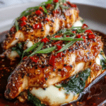 This Spinach & Mozzarella Stuffed Chicken with Garlic Glaze is a deliciously cheesy and flavorful meal that’s perfect for weeknight dinners or special occasions. Tender chicken breasts are filled with fresh spinach, roasted red peppers, and mozzarella, then glazed with a sweet and garlicky sauce for an irresistible finish.