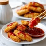 Store leftover chicken and sauce separately in airtight containers in the refrigerator for up to 2 days. Reheat chicken in a hot oven or air fryer to restore crispness before serving. Warm the sauce gently on the stovetop, stirring to recombine if it has thickened or formed a film.