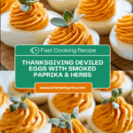 A festive Thanksgiving Deviled Eggs recipe featuring creamy, tangy filling with a smoky paprika twist, garnished with fresh sage and thyme for an elegant holiday appetizer.